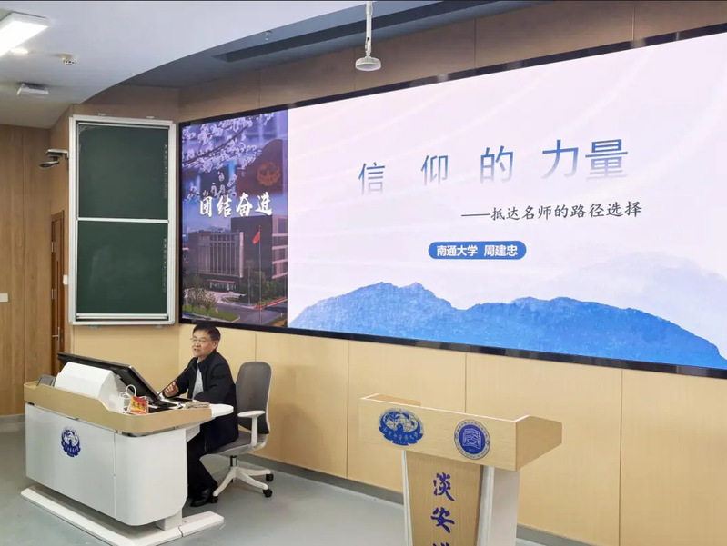 周教授以“信仰的力量——抵达名师的路径选择”为题,结合其丰富的教学经验,从时代挑战、学院运行、教师职业、课程建设四大方面展开分享。他以《形成中的学科》等教育与科学领域的荐读书目为切入点,引导教师深入思考人工智能时代教育变革的方向与教师角色的核心内涵。周教授用“有深度的编剧、有主见的导演、有内涵的演员、有层次的专家”生动阐释了教师的角色要义,为在场教师实现专业成长提供了切实启发。